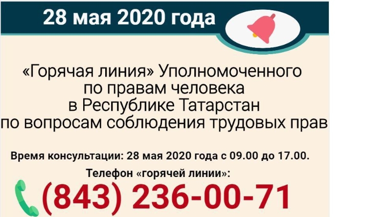 2020 елның 28 маенда Татарстан Республикасында Кеше хокуклары буенча вәкаләтле вәкил гражданнарга хокукый ярдәм күрсәтү һәм гражданнарның хокукларын саклауны тәэмин итү максатыннан республика гражданнарының хезмәт хокукларын яклау мәсьәләләре буенча «кайнар линия» үткәрә. Татарстан Республикасында Кеше хокуклары буенча вәкаләтле вәкил, Татарстан Республикасы Прокуратурасы, Татарстан Республикасы Хезмәт, мәшгульлек һәм социаль яклау министрлыгы һәм Татарстан Республикасы буенча Дәүләт хезмәт инспекциясе вәкилләре гражданнарга тулы мәгълүмат алырга, бәхәсле хәлләрне аңлатырга ярдәм итәчәкләр. "Кайнар линия" телефоны: (843) 236-00-71. Консультация вакыты: 9 сәгатьтән алып 17 сәгатькә кадәр.