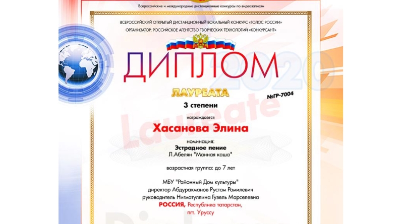 «7 нота» балалар вокаль ансамбленең әзерлек төркеменең яшь катнашучысы Элина Хәсәнова (җит. Г.М. Нигъмәтуллина), Л. Абелянның «Манный боткасы» җыры белән «Россия тавышы» Бөтенроссия ачык дистанцион вокаль бәйгесендә «Эстрада җыры» номинациясендә III дәрәҗә лауреат калды.