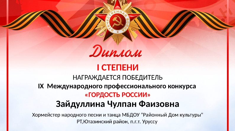 Район мәдәният йорты хормейстеры Зәйдуллина Чулпан Фәиз кызын "Җыр да сугышты" номинациясендә «А закаты алые» җыры белән 1 нче урынны яулады. Аңа киләчәктә дә уңышлар телибез!