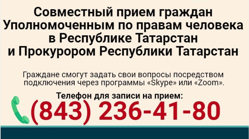 2020 елның 14 июлендә Татарстан Республикасында Кеше хокуклары буенча вәкаләтле вәкилнең һәм Татарстан Республикасы Прокурорының гражданнарны бергәләп кабул итүе уздырылачак. Кабул итүгә алдан язылу өчен телефон: (843) 236-41 - 80 (Татарстан Республикасында Кеше хокуклары буенча вәкаләтле вәкилнең кабул итү бүлмәсе). Гражданнар Сәрия Сабурская һәм Илдус Нәфыйковка «Skype» яки «Zoom» программалары аша турыдан-туры тоташтыру юлы белән үз сорауларын бирә алалар.