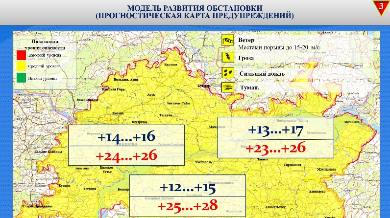 Алмашынучан болытлы һава. Урыны белән кыска вакытлы яңгыр, урыны белән көчле яңгыр, яшен. Төнлә һәм иртән аерым районнарда томан. Җил көньяк-көнбатыштан секундына 4-9 м, урыны белән көчәйгәндә 13 м/с га кадәр, яшен вакытында 15-20 м / с га кадәр.