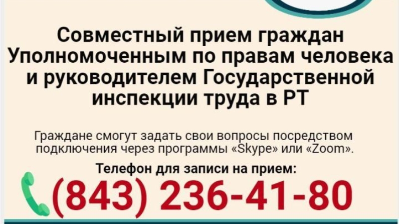 2020 елның 18 августында 14.00 сәгатьтән 16.00 сәгатькә кадәр Татарстан Республикасында Кеше хокуклары буенча вәкаләтле вәкил Аппаратында (Казан шәһәре, Карл Маркс ур., 61 нче йорт) Татарстан Республикасында Кеше хокуклары буенча вәкаләтле вәкил һәм Татарстан Республикасында Дәүләт хезмәт инспекциясе җитәкчесе тарафыннан гражданнарны бергәләп кабул итү оештырыла.