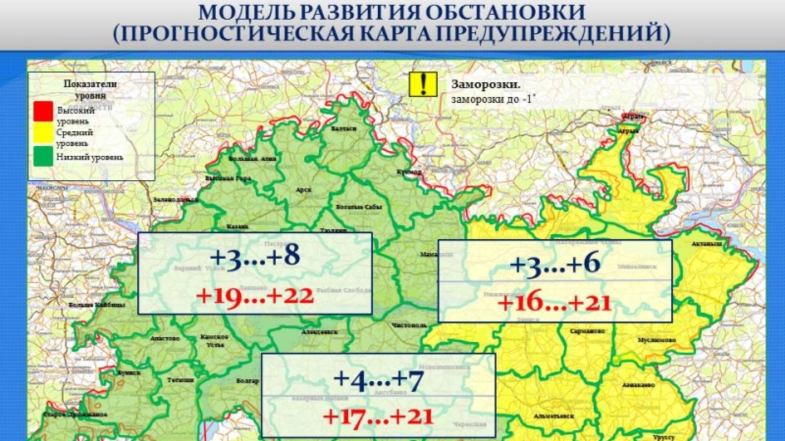 Алмашынучан болытлы һава. Явым-төшемсез. Җил тотрыксыз, секундына 3-8 метр тизлектә. Минималь һава температурасы төнлә +3.. +8˚, урыны белән -1 градуска кадәр салкын. Көндез максималь һава температурасы +16..+22˚