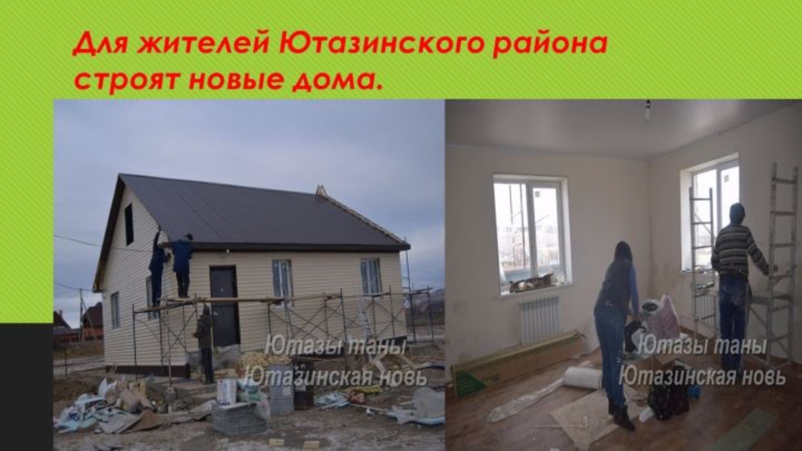 Әлеге программаның наем буенча торак төзелеше юнәлешендә “Вафауллин Ансель” фермер хуҗалыгы савымчысы Анастасия Ильдукова өчен Ютазы авылында мәйданы 90 квадрат метрдан артык булган шәхси торак төзелеше тәмамлану стадиясендә. Өч бүлмәдән торган йортны кыска вакыт эчендә тергезеп бирүдә бик күп кеше катнашты. “Эшне билгеләнгән срокта башкарып чыгуда төп пордрядчы белән беррәттән объектны коммуникация уңайлыкларына тоташтыруда район хезмәтләренең дә бердәм эш итүе зур роль уйнады”, - дип ассызыклады район башлыгы урынбасары Закуан Ильясов.