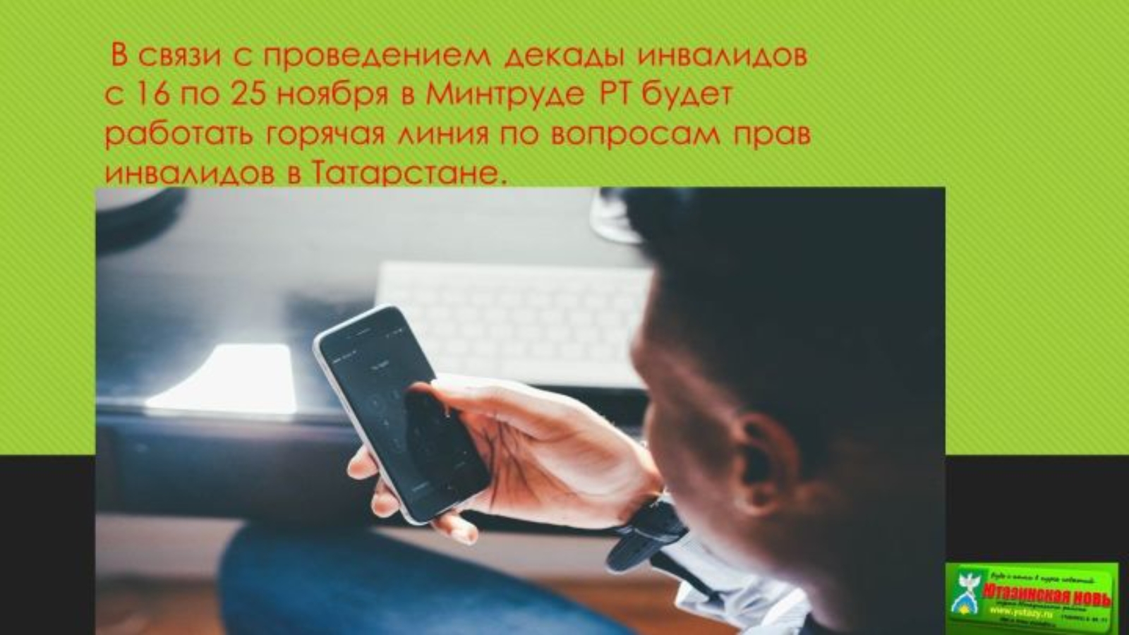 (Казан, 23 ноябрь, “Татар-информ”). Инвалидлар декадасы уңаеннан 16 ноябрьдән 25 ноябрьгә кадәр Татарстан Республикасы Хезмәт, халыкны эш белән тәэмин итү һәм социаль яклау министрлыгында Татарстанда инвалидлар хокуклары мәсьәләләре буенча кайнар линия эшләячәк. Бу хакта ТР Хезмәт, мәшгульлек һәм социаль яклау министрлыгы матбугат хезмәте хәбәр итә.