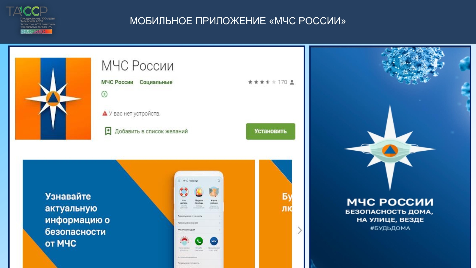«Россия гадәттән тыш хәлләр министрлыгы» мобиль кушымтасы мәгълүмати-аналитик үзәк белгечләре тарафыннан эшләнгән һәм Google Play, App Store онлайн-кибетләрендә iOS һәм Android операцион системаларында эшләү өчен бушлай скачать итеп алу мөмкинлеге бар.
