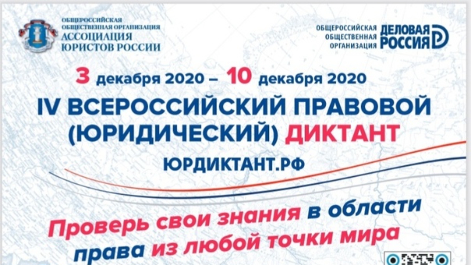2020 елның 3-10 декабрендә халыкның хокукый грамоталылыгы дәрәҗәсен бәяләү максатларында, дүртенче Бөтенроссия хокукый (юридик) диктанты узачак. Диктантны оештыручылар - «О.Е. Кутафин исемендәге Мәскәү дәүләт юридик университеты» федераль дәүләт бюджет югары белем бирү учреждениесе ярдәме белән «Россия юристлары ассоциациясе» Гомумроссия иҗтимагый оешмасы һәм «Эшлекле Россия» Гомумроссия иҗтимагый оешмасы. Диктантның төп бурычлары - халыкның төрле катлауларының хокукны өйрәнүгә мотивациясен арттыру, аның яшь һәм социаль структурасын исәпкә алып, Россия халкының хокукый грамоталылыгы дәрәҗәсе турында объектив мәгълүмат алу, массакүләм мәгълүмат чараларын һәм Россия җәмгыятен халыкның хокукый культурасы дәрәҗәсен күтәрү мәсьәләләренә җәлеп итү, белем бирү программаларын камилләштерү буенча тәкъдимнәр эшләү. Яңа коронавирус инфекциясе - COVID-19 таралуын кисәтү максатларында, диктант онлайн режимда РФ юрдиктант.рф рәсми порталында үткәрелә.