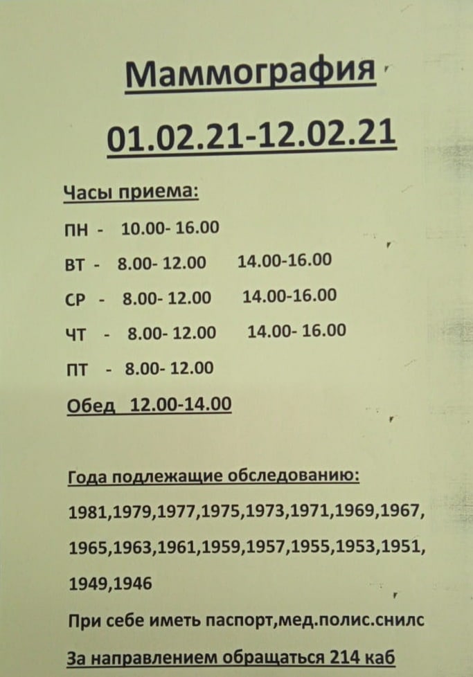Маммограф Урыссу РҮХ бинасында рентгенология бүлегенә керү ишегенә каршы бүлмәдә булачак. Хатын-кызларны кабул итү график буенча башкарылачак.