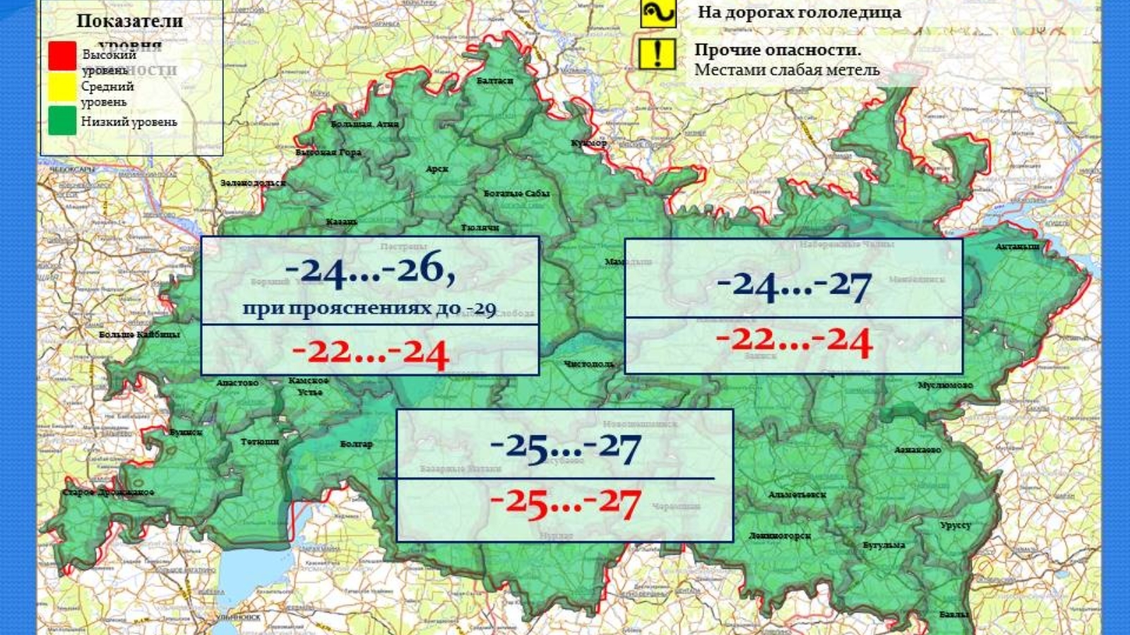 Аязучан болытлы һава. Төнлә бераз кар, урыны белән буран. Көндез күпчелектә явым-төшемсез. Җил көнбатыштан, төньяк-көнбатыштан, секундына 6-11 метр, урыны белән көчәйгәндә 14 метрга кадәр. Минималь һава температурасы төнлә -24..-27˚. Көндез максималь һава температурасы -22..-24˚. Юлларда бозлавык.