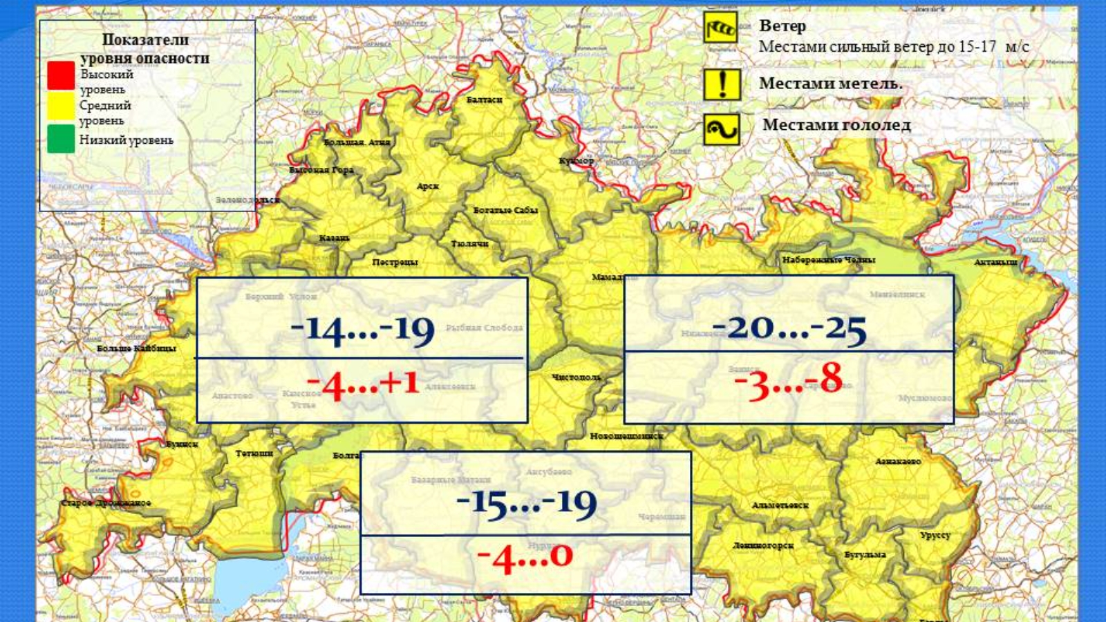 Болытлы, төнлә аязучан. Төнлә явым-төшемсез, иртән һәм көндез кар, юеш кар. Аерым районнарда буран, көндез бозлавык. Җил көньяк-көнбатыштан секундына 6-11 метр, төнлә урыны белән көчәйгәндә, секундына 14 метрга кадәр, көндез 17 метрга кадәр. Төнлә һаваның минималь температурасы -14..-19˚, көнчыгышта -25 градуска кадәр. Көндез максималь һава температурасы - -4..+1 ˚, көнчыгышта -8 градус. Юлларда бозлавык.