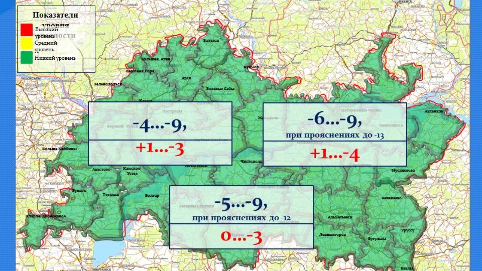 Аязучан болытлы һава. Бераз кар, аерым районнарда бераз буран. Җил көньяк-көнчыгыштан секундына 5-10 метр, урыны белән көчәйгәндә, 13 метрга кадәр. Төнлә һаваның минималь температурасы -5..-9 градус, аязган вакытта -13 градуска кадәр. Көндез максималь һава температурасы +1..-4˚. Юлларда бозлавык.