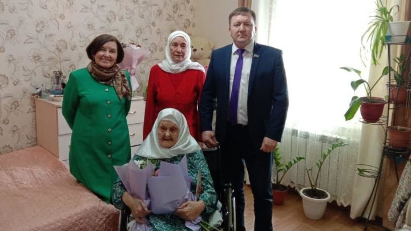 Сугыш афәтләрен кичергән, әсирлектә булган ветеранны күркәм гомер бәйрәме белән котлап, район башлыгы урынбасары Закуан Ильясов һәм Ютазы авылы ветераннар советы рәисе Фәния Әхмәтшина, шулай ук район хатын-кызлар советы рәисе Наилә Хөснетдинова тантана сәбәпчесенә чәчәкләр һәм бүләк тапшырдылар.