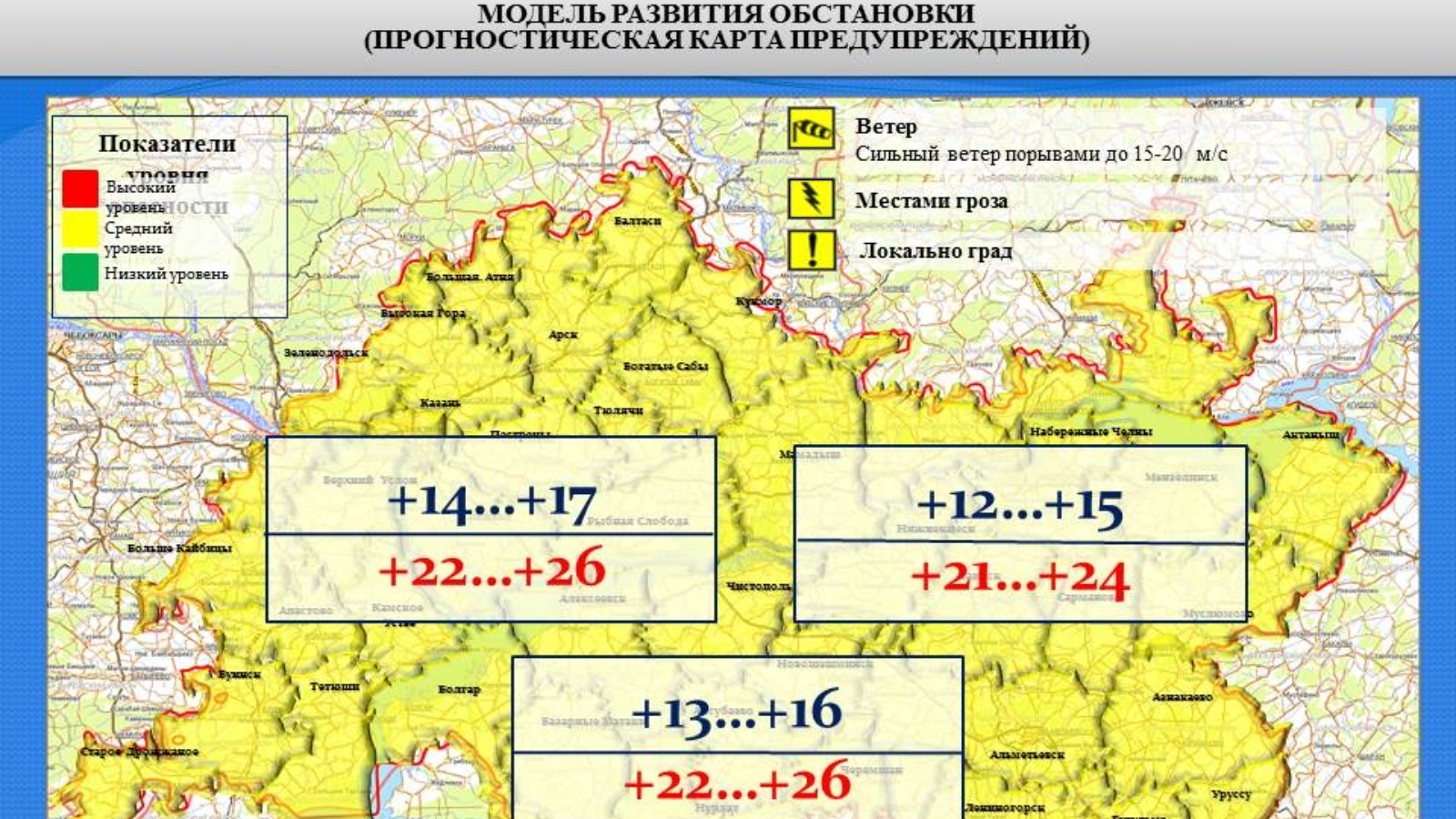 Аязучан болытлы һава. Урыны белән кыска вакытлы яңгыр. Аерым районнарда күк күкрәп, яшен яшьнәп - яңгыр, урыны белән боз яварга мөмкин. Җил төньяк-көнчыгыштан көньяк-көнчыгышка таба күчә, секундына 6-11 метр, урыны белән көчәйгәндә 14 метрга кадәр, яшенле яңгыр вакытында 15-20 метрга кадәр. Төнлә һаваның минималь температурасы +12..+15˚, максималь температура көндез +21..+24˚.