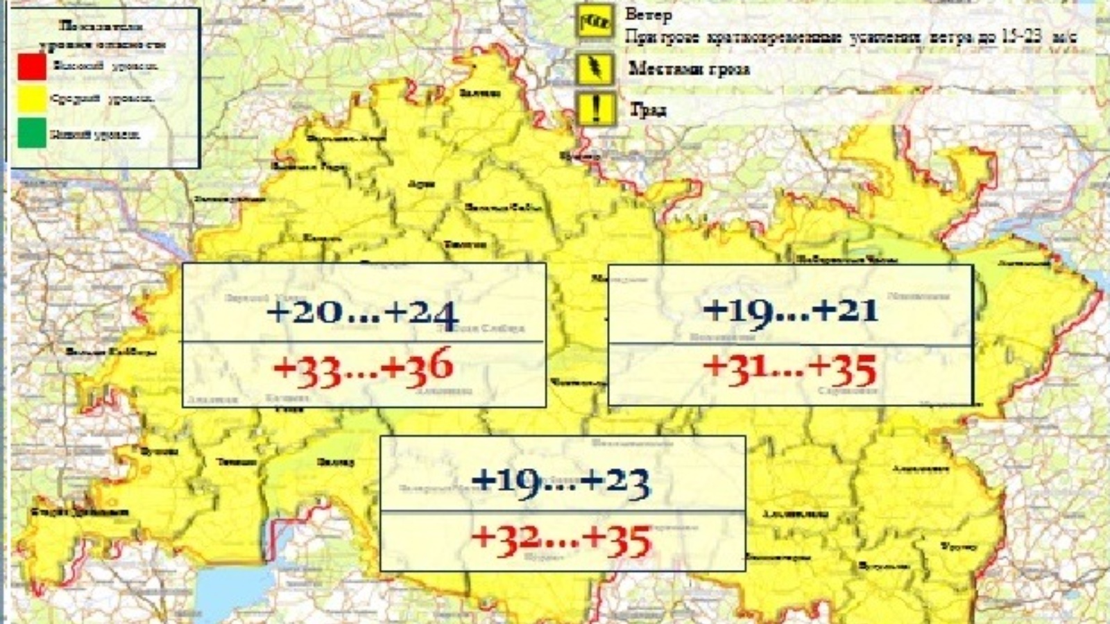 Җил көньяктан, көньяк-көнбатыштан, секундына 5-10 метр, яшен вакытында 15-20 метрга кадәр көчәюе, урыны белән секундына 23 метрга кадәр җитүе көтелә. Төнлә һаваның минималь температурасы +19..+21˚. Һаваның максималь температурасы көндез + 31..+35˚.