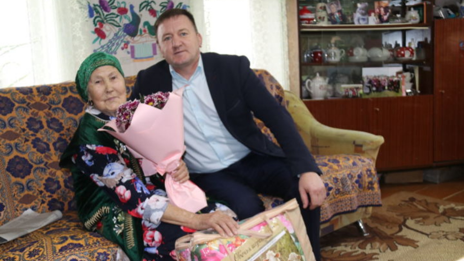 Улы гаиләсе белән яшәүче, мактау грамоталарына һәм медальләргә лаек булган хезмәт ветераны Фәһимова Ахун кызы Шиһапованы котларга район башлыгы урынбасары Закуан Ильясов, Бәйрәкәтамак авыл җирлеге башлыгы Фларис Әхмәтов, район ветераннар советы рәисе Владимир Петров, туганнары һәм якыннары килгән иде.