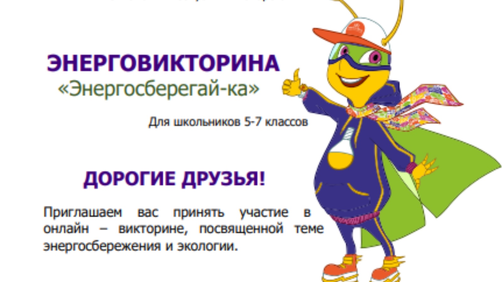 Татарстан Республикасы сәнәгать һәм сәүдә министрлыгы, «Татарстан Республикасы Энергия ресурсларының нәтиҗәле технологияләре үзәге» ДАУ белән берлектә, мәктәп укучылары катнашында «Экология һәм энергияне сак тоту» темасына «Энергосберегай-ка» интеллектуаль-танып-белү энерговикторинасы үткәрү турында хәбәр итә.