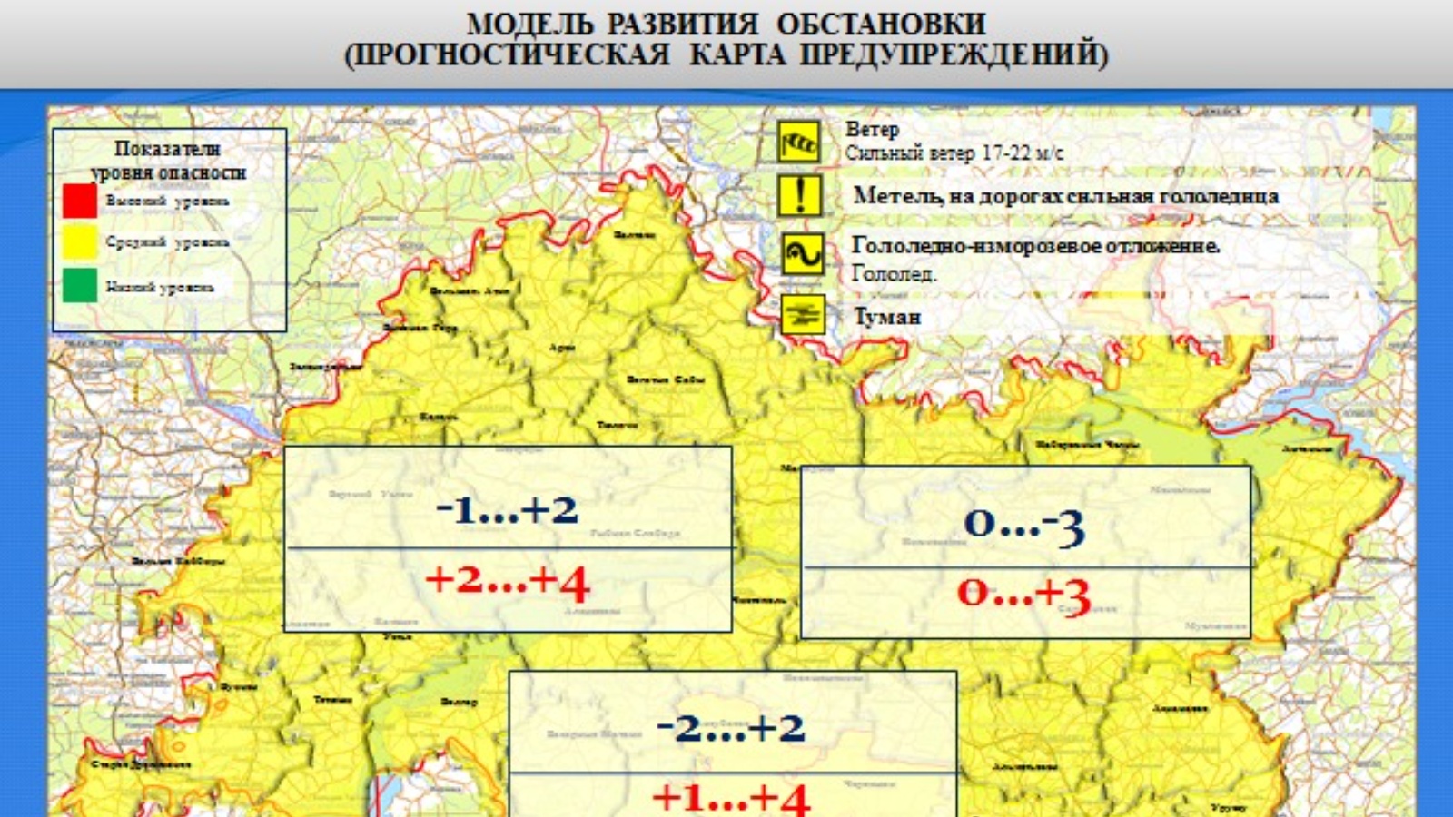 Аязучан болытлы һава. Төнлә урыны белән бераз кар, юеш кар. Көндез юеш кар һәм яңгыр рәвешендә явым-төшем. Аерым районнарда буран, бозлавык һәм томан. Җил көньяктан, көньяк-көнбатыштан 8-13 м / с, урыны белән 17-22 м / с тизлектә, төнлә һаваның минималь температурасы 0...-3˚. Һаваның максималь температурасы көндез 0..+3˚. Юлларда бозлавык, урыны белән көчле.