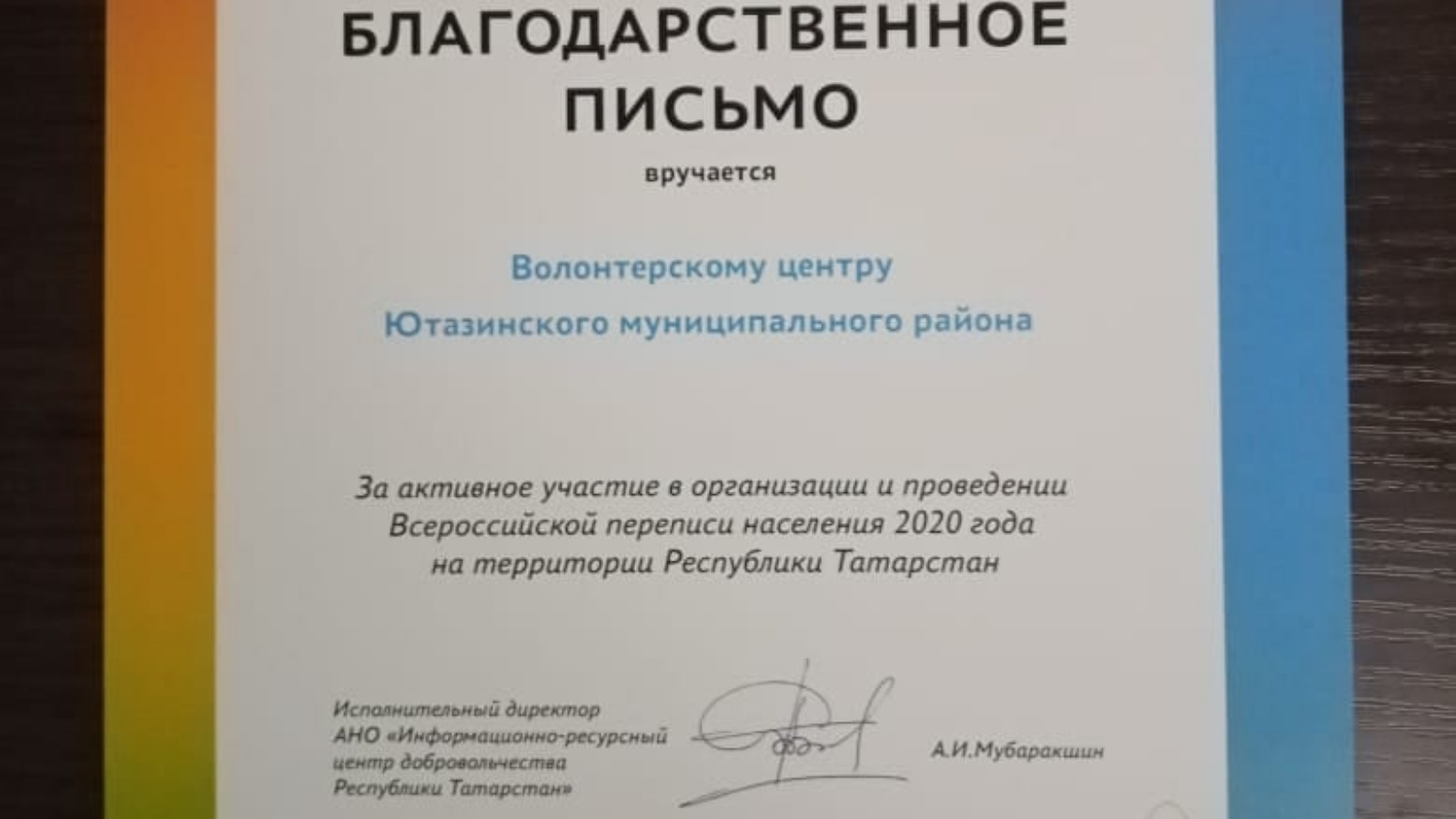Ютазы районы яшьләр бүлегенең волонтерлык үзәге Татарстан Республикасы территориясендә 2020 елгы Бөтенроссия халык санын алуны оештыруда һәм үткәрүдә актив катнашканы өчен Рәхмәт хаты алды. Афәрин, безнең котлауларны кабул итегез!