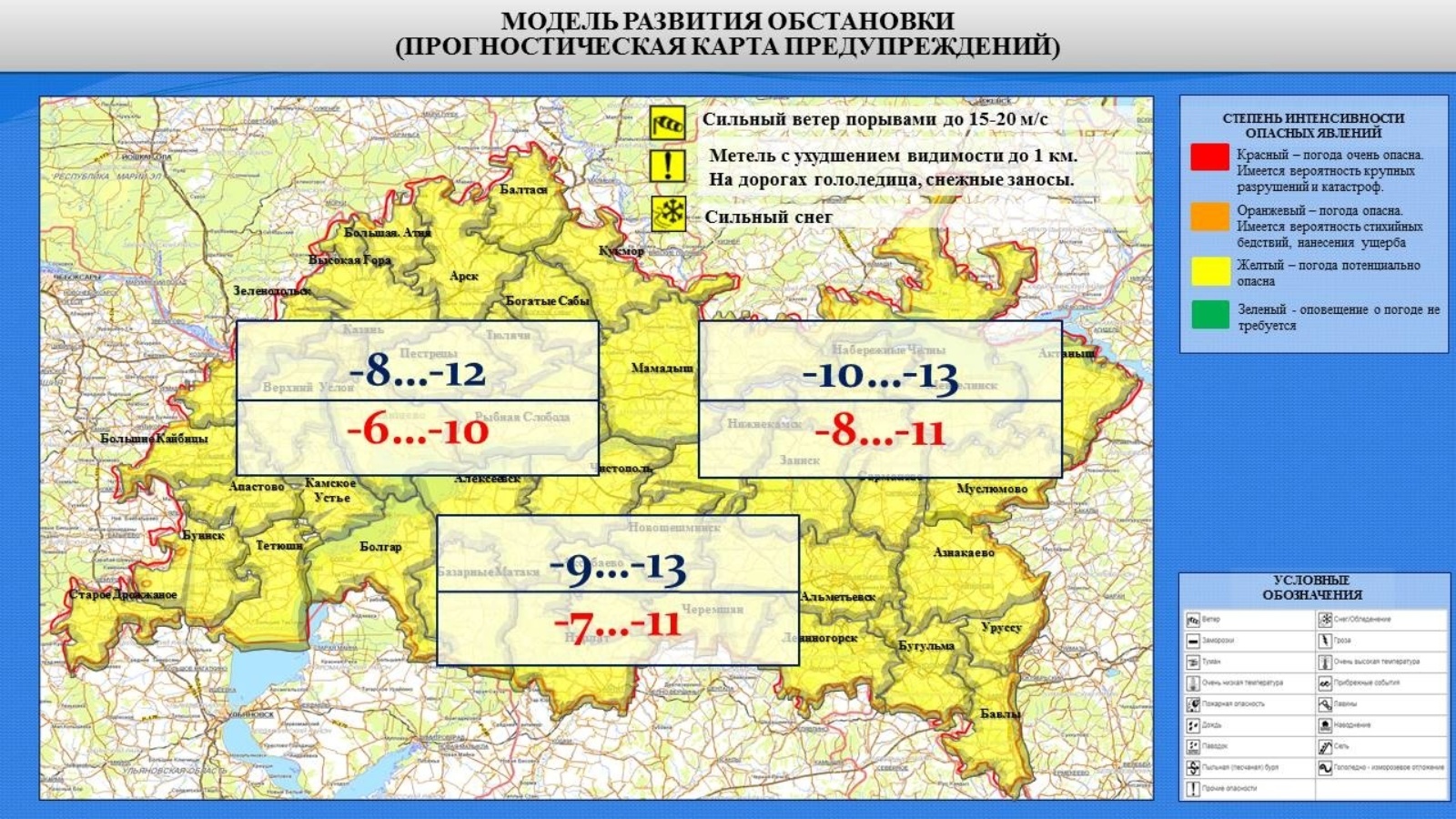 Болытлы. Кар, буран. Җил көньяктан, көньяк-көнбатыштан, секундына 8-13 метр, урыны белән секундына 15-20 метр тизлектә, төнлә һаваның минималь температурасы -10..-13˚. Көндез максималь һава температурасы -8..-11˚. Юлларда кар көртләре, урыны белән бозлавык.