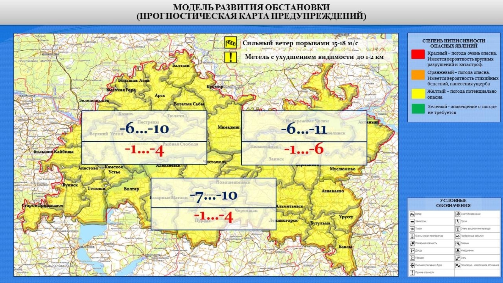 Болытлы, төнлә аязучан. Төнлә явым - төшемсез. Көндез кар, урыны белән буран. Җил көньяктан секундына 7-12 метр, урыны белән көчәйгәндә 18 метрга кадәр, төнлә һаваның минималь температурасы -8..-11˚. Көндез максималь һава температурасы -3..-6˚. Юлларда бозлавык.