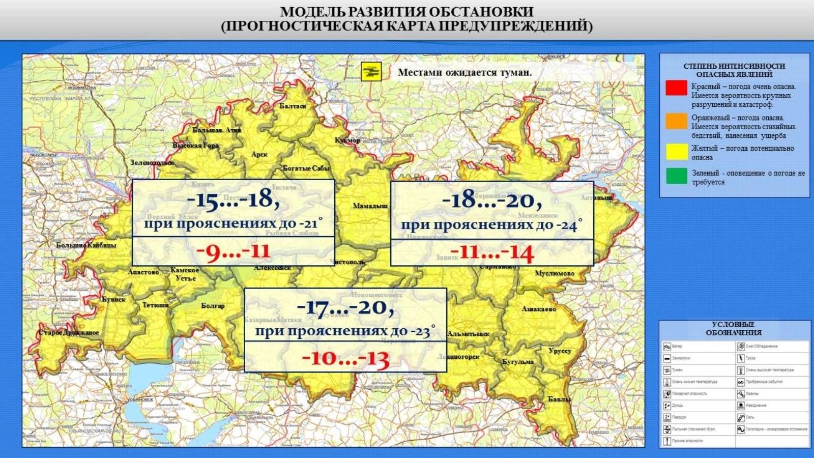 Аязучан болытлы һава. Бераз кар, төнлә урыны белән, аерым районнарда томан. Көндез урыны белән бераз кар. Җил көньяк-көнчыгыштан, көньяктан секундына 4-9 метр тизлектә. Минималь һава температурасы төнлә һәм иртән -18..-20˚, аязган вакытта -24˚ка кадәр. Көндез максималь һава температурасы -11..-14˚. Юлларда бозлавык.