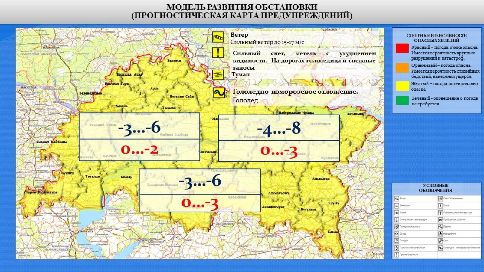 Болытлы. Кар, көндез юеш кар, урыны белән көчле. Урыны белән буран, бозлавык. Җил көньяктан,көньяк-көнчыгыштан, секундына 6-11 метр, урыны белән көчәйгәндә 17 метрга кадәр. Һаваның минималь температурасы төнлә -4..-8˚. Һаваның максималь температурасы көндез 0..-3˚. Юлларда кар көртләре, бозлавык.