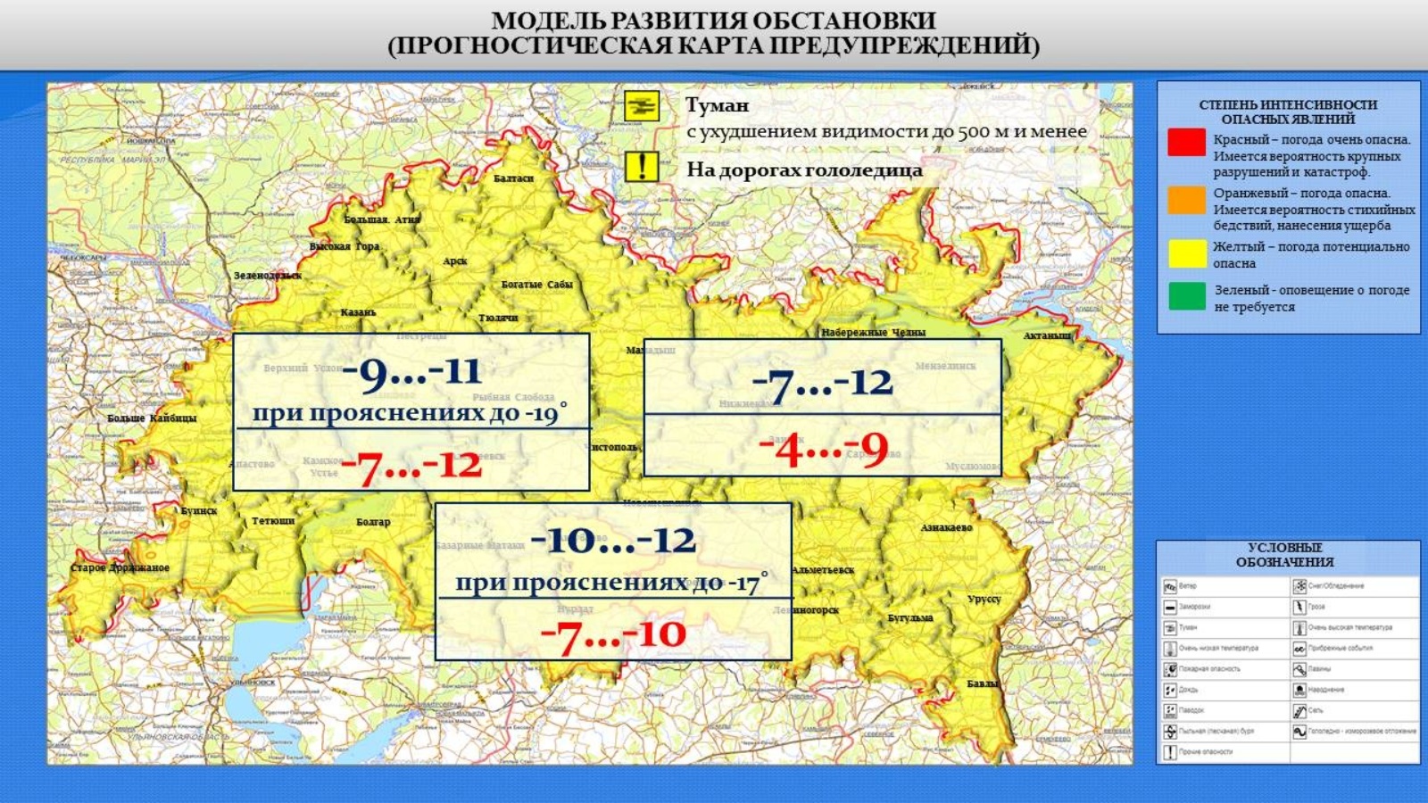 Аязучан болытлы һава. Бераз кар, төнлә урыны белән уртача күләмдә кар. Төнлә һәм иртән аерым районнарда томан. Җил тотрыксыз, секундына 3-8 метр тизлектә. Төнлә һаваның минималь температурасы -7..-12˚. Көндез максималь һава температурасы -4..-9˚. Юлларда бозлавык.