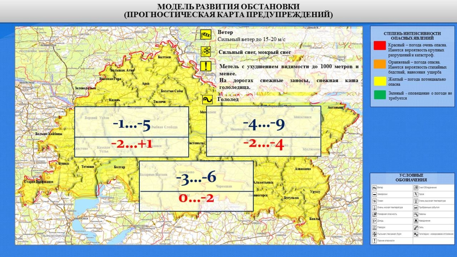 Болытлы, төнлә аязучан. Кар, юеш кар, көндез урыны белән көчле.Урыны белән буран, бозлавык. Җил көньяктан , секундына 7-12 метр, урыны белән көчәйгәндә, 15-20 метр. Минималь һава температурасы төнлә -4..-9 градус, көндез максималь һава температурасы -2..-4˚. Юлларда кар көртләре, кар боткасы, бозлавык.