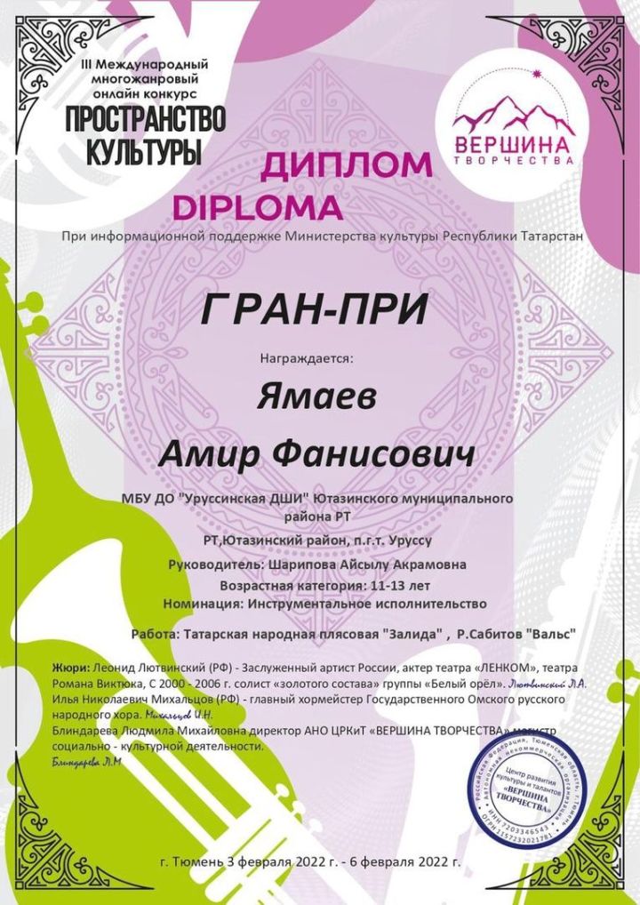 Бу уңышка аны тырышлыгы, хезмәт сөючәнлеге һәм сабырлык белән даими дәресләрдә шөгыльләнүе китергән. Шулай ук ll дәрәҗә лауреат Артем Деминны да котлыйбыз. Бу эштә аларга укытучылары Айсылу Шәрипова һәм әти-әниләре булышкан. Әмир Ямаевны һәм Артем Деминны котлыйбыз. Аларга яңа җиңүләр һәм иҗади уңышлар телибез.