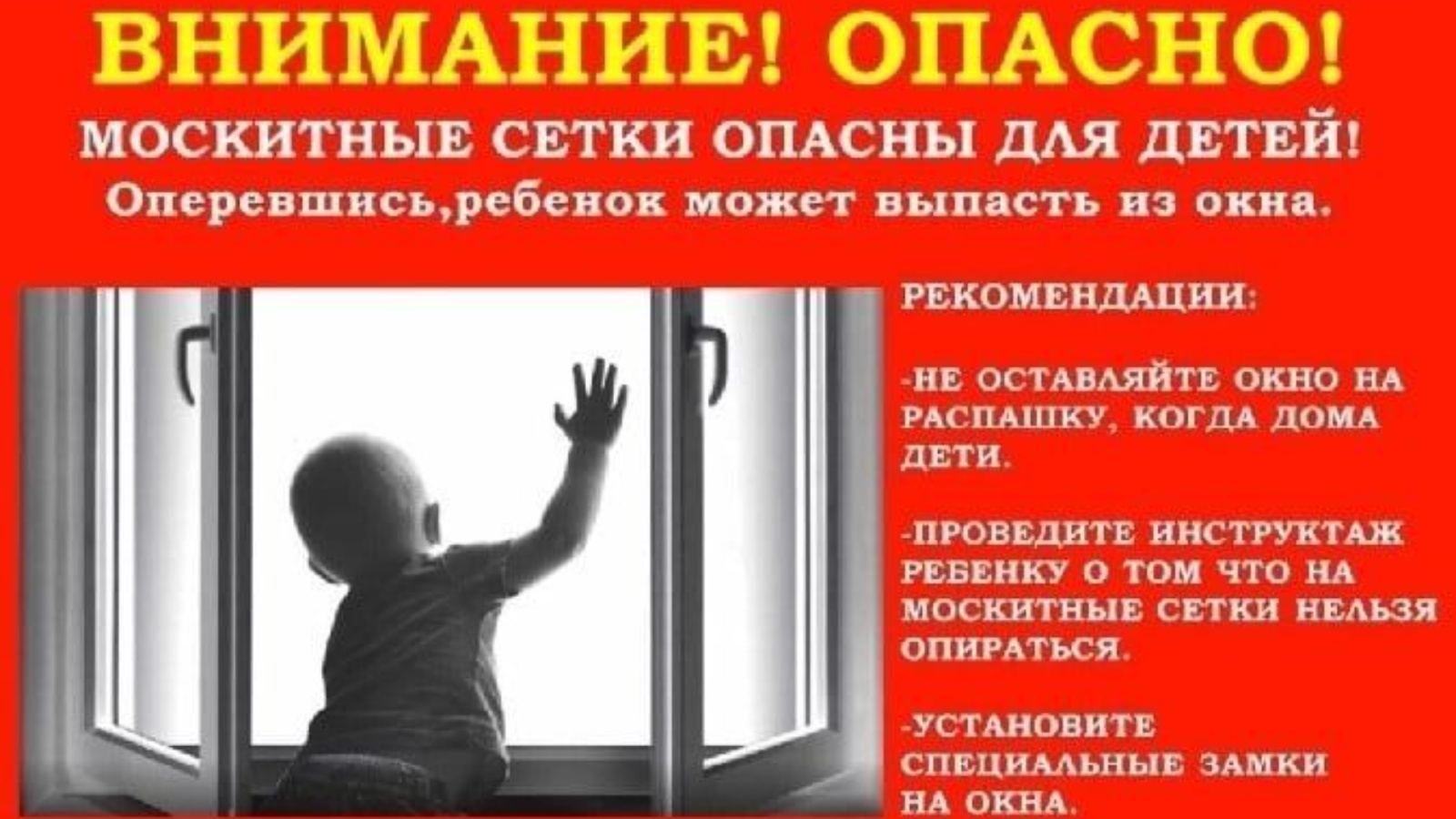 ✔ тәрәзәләрдә балаларны саклау чараларын инкяр итмәгез: бала булган йортта металл-пластик тәрәзәләрне ачуны блоклаучы махсус җайланмалар белән җиһазландырырга кирәк;