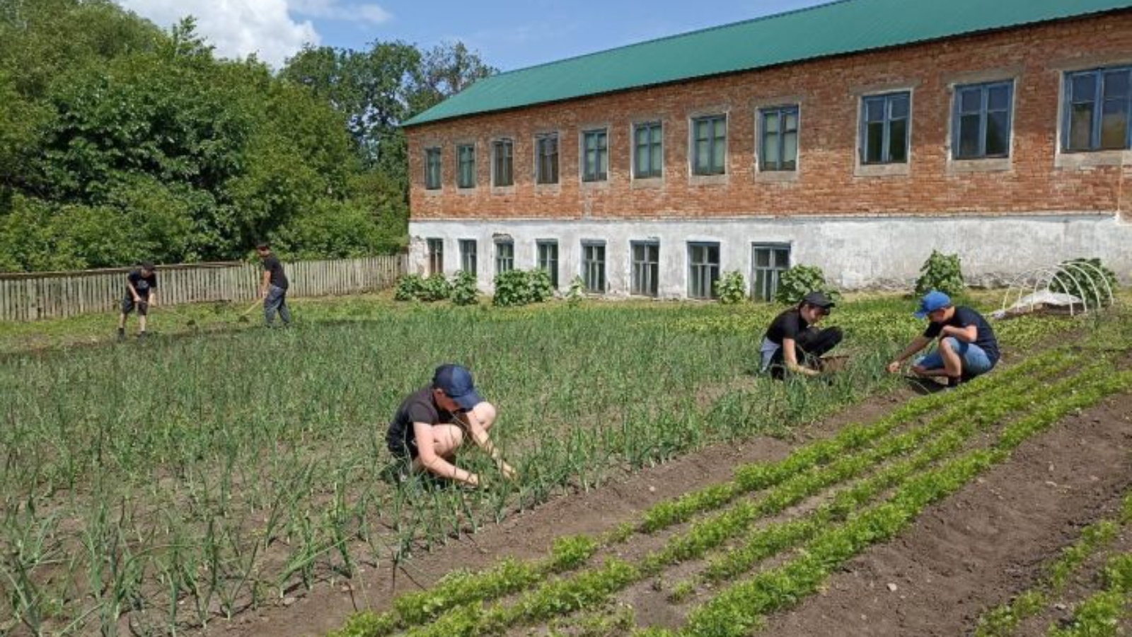 Хезмәт десанты барышында балалар бәрәңге куаклары тирәсендәге чүп үләннәрен утадылар.