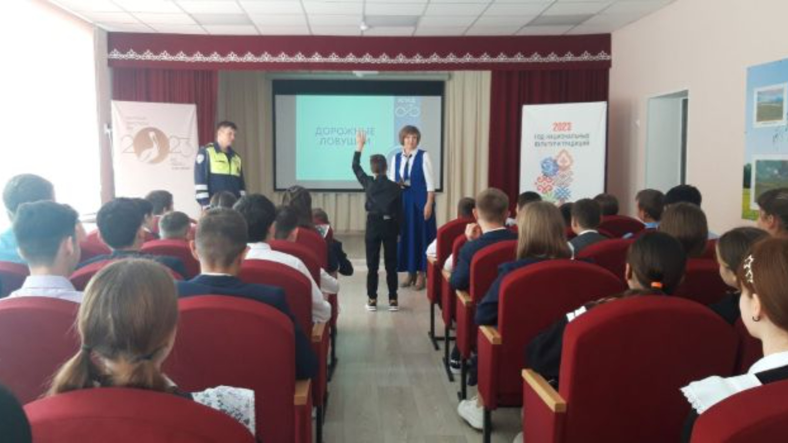 Мәктәп укучыларына юлларда үзләрен тотышлары һәм куркынычсызлык кагыйдәләре турында искә төшерделәр. Балалар чыгыш ясаучыларны игътибар белән тыңладылар.