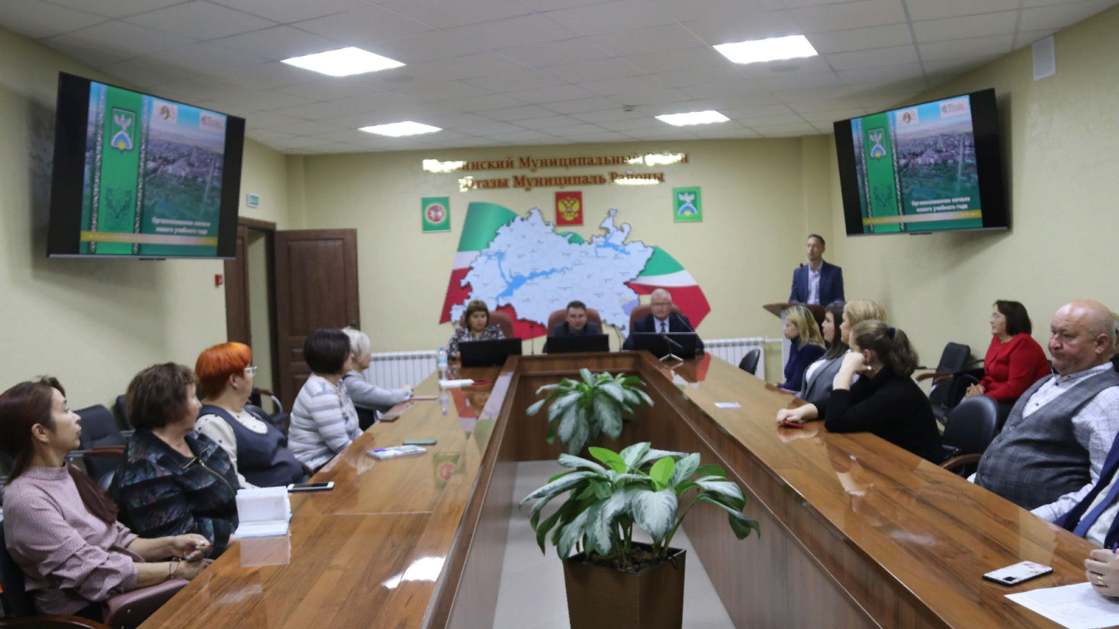 Мәгариф бүлеге начальнигы Сергей Абрамов җыелучылар алдында доклад-презентация белән чыгыш ясады. Ул мәгариф системасындагы яңалыклар, уку йортларына йөрү дәрәҗәсе һәм мәктәп туклануын оештыру турында сөйләде.