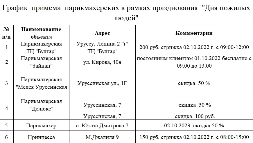 "Өлкәннәр көне"н бәйрәм итү кысаларында чәчтарашханәләрнең кабул итү графигы