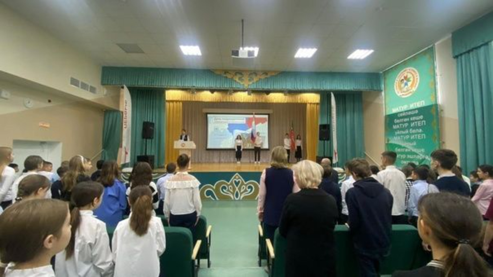 Дүшәмбе иртәсе гимназиядә традицион рәвештә Россия Федерациясе һәм Татарстан Республикасы флагларын чыгару тантанасыннан башланды.