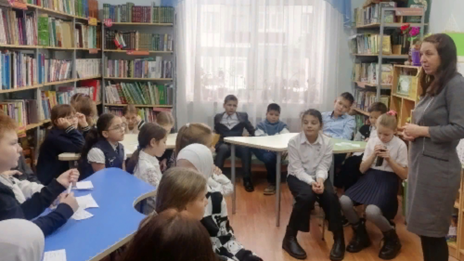 Китапханәче Кадрия Заһретдинова балаларга илебезнең территория буенча дөньяда иң зур булуын һәм анда гасырлар дәвамында 100дән артык телдә сөйләшүче 200дән артык милләт вәкиле тату яшәве турында сөйләде.