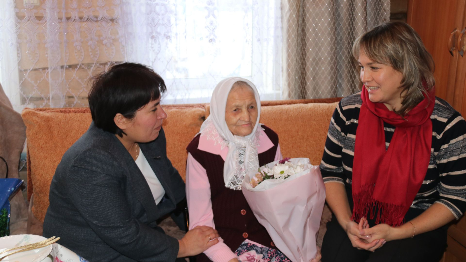 Район җитәкчелеге исеменнән юбилярны гомер бәйрәме белән котларга мөлкәт һәм җир мөнәсәбәтләре палатасы рәисе Алинә Хөббәтова килде. Олы яшьтәге хатынга үзенең изге теләкләрен җиткергәннән соң, ул чәчәкләр һәм бүләк тапшырды. Котлауларга Бәйрәкә авыл җирлеге башлыгы Альбина Әхмәтшина да кушылды. Җиһан апаның дүрт кызының балачагы һәм үсмер вакыты үткән йортта тәм-томнардан сыгылып торган өстәл, игелекле мохит - барысы да йортның көмеш чәчле хуҗабикәсенә хөрмәт билгеләрен күрсәтте.