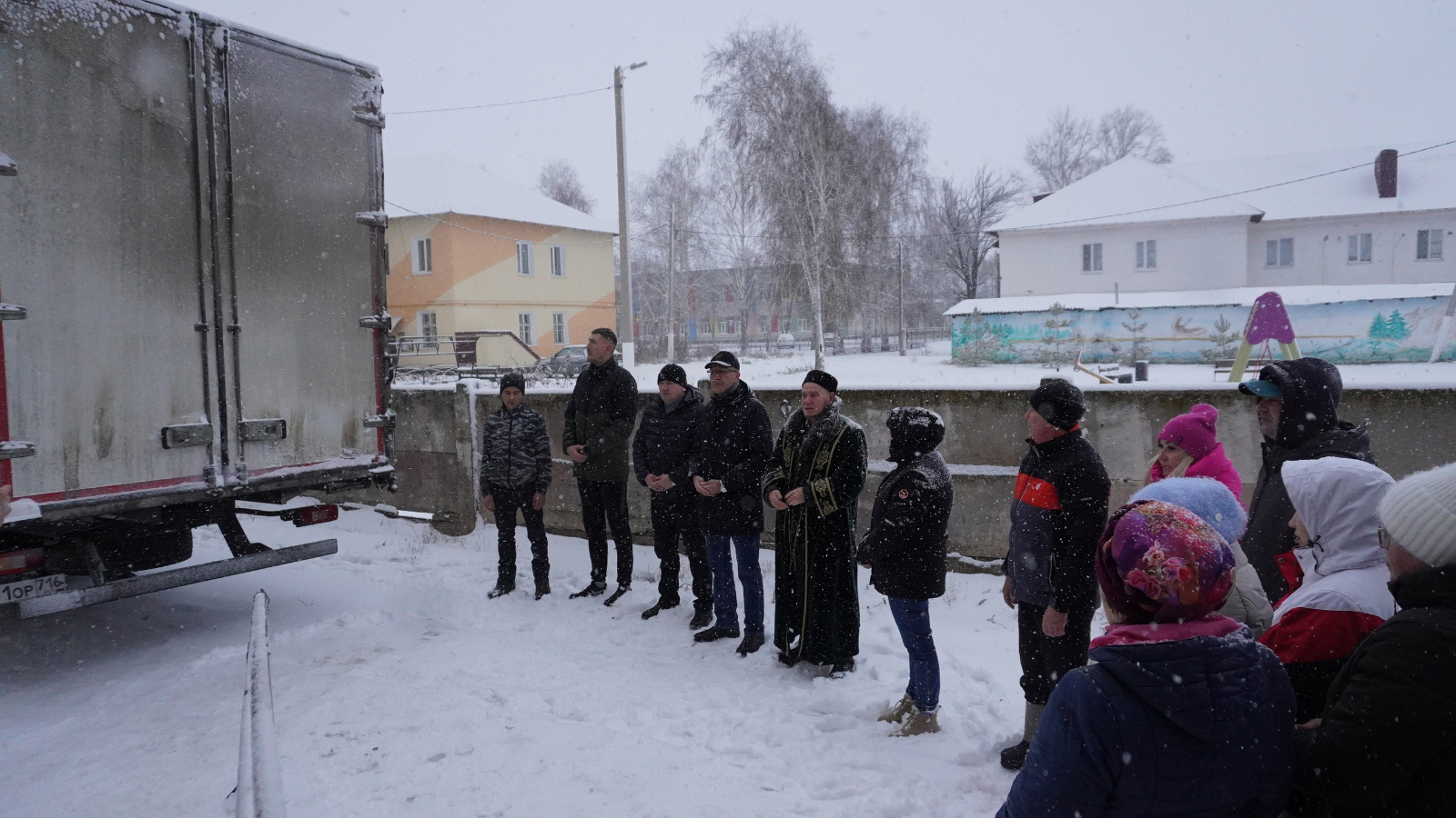 Юлга хәзрәттән фатыйха алганнан соң, гуманитар ярдәм белән йөк машинасы юлга кузгалды.