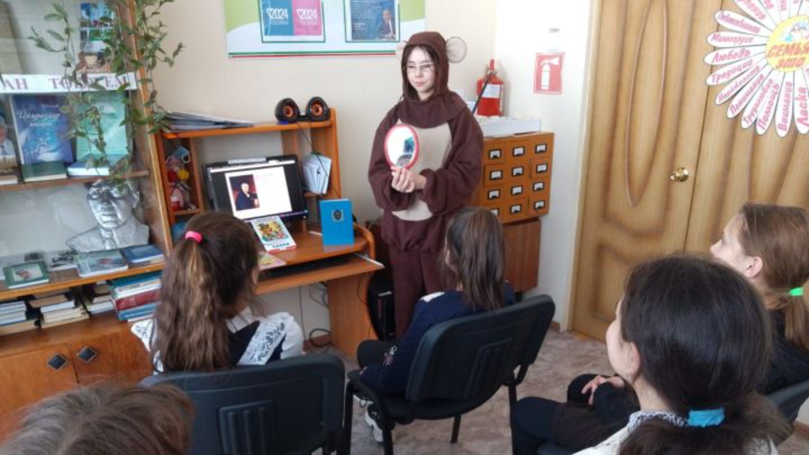 Китапханәче Ирина Әхмәтова укучыларны бөек рус әкиятчесенең биографиясе һәм иҗаты белән таныштырды.
