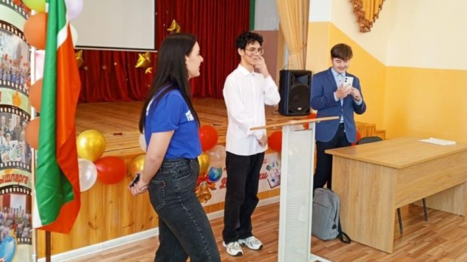 Ютазы мәктәбенең актлар залында югары сыйныф укучылары «Коррупция, әйдәгез хәл итик» дип исемләнгән коррупциягә каршы чарада катнашырга җыелды.