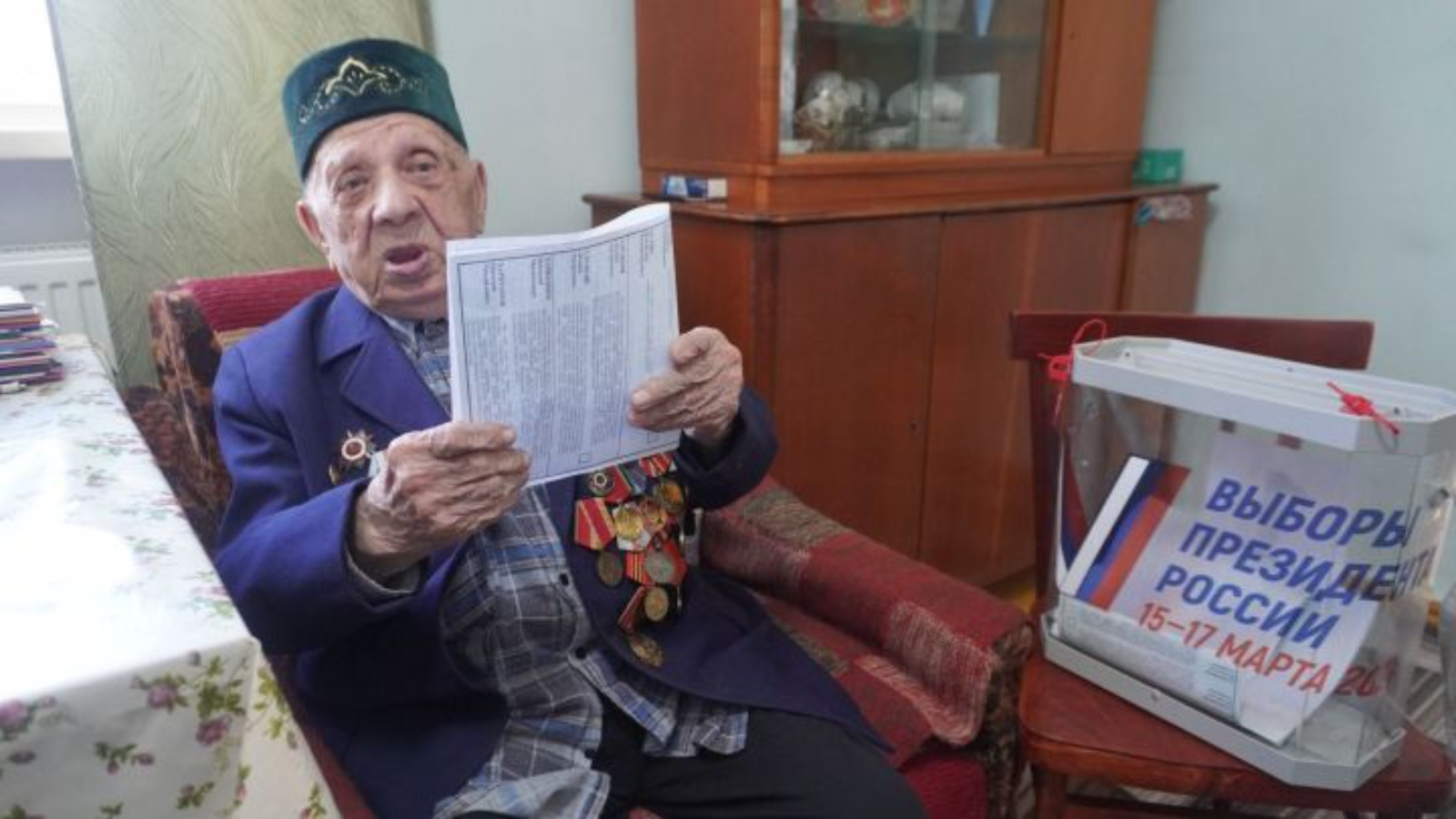Дәүләт башлыгы кандидаты өчен тавыш бирүнең конституцион хокукыннан ул өйдә файдаланды. УСК әгъзалары Ветеранга өйгә сайлау тартмасын алып килделәр. Бу аңлашыла да, чөнки быел ветераныбыз үзенең 100 еллык юбилеен билгеләп үтә.