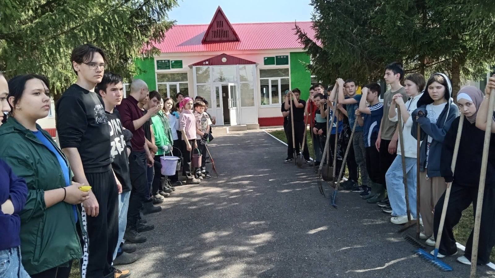 Һәр ел мәктәп укучылары һәм коллективы чүп-чар, коры яфрак җыю буенча эш алып баралар, ишегалдында, спорт мәйданчыгында тәртип урнаштыралар. Бүген, 19 апрельдә, мәктәп укучылары сыйныф җитәкчеләре белән бергә яңадан эш инвентары белән коралланып, өмәгә чыктылар.