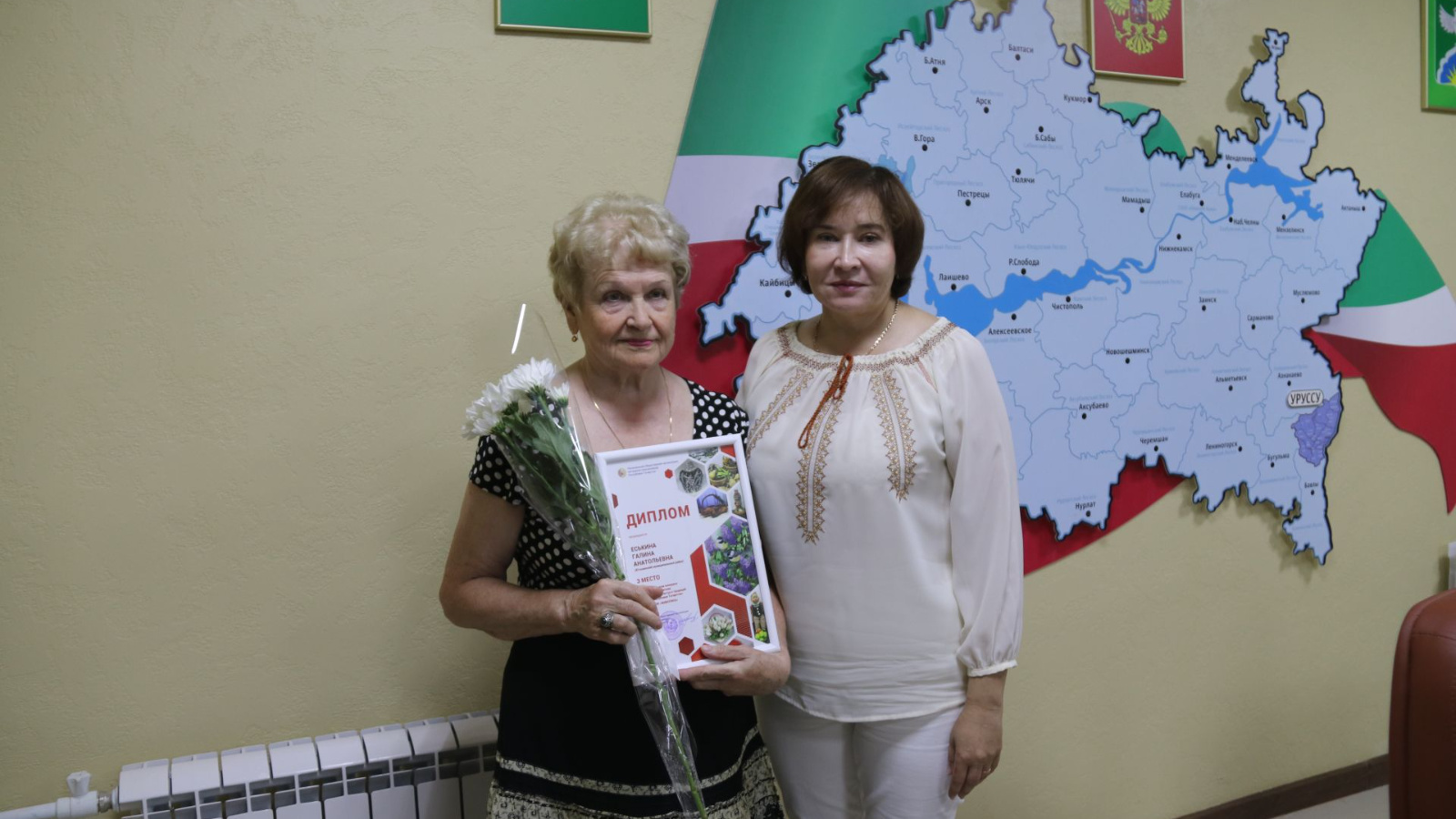 Дипломнарны һәм чәчәкләрне район башкарма комитеты җитәкчесе Светлана Самонина тапшырды.