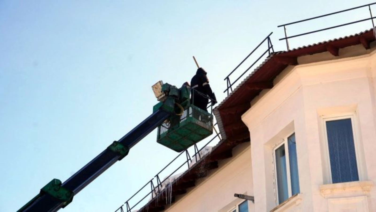 Коммуналь хезмәтләр күпфатирлы йортларның түбәләреннән кар һәм бозны чистарту белән шөгыльләнә.