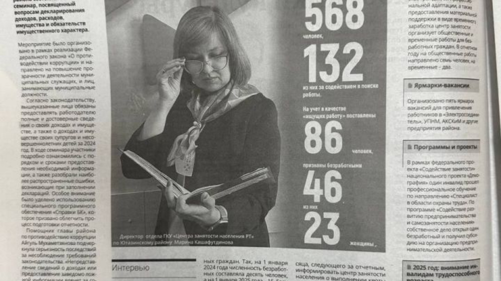 Икенче биттә укучыларны мәшгульлек үзәге директоры Марина Кашафетдинова белән тәфсилле интервью көтә. Материалдан сез 2024 елда районда яшәүчеләрнең күпмесе эшкә урнашуда ярдәм сорап мөрәҗәгать иткәнен белерсез, шулай ук хезмәт базары турындагы актуаль мәгълүмат белән танышырсыз. Монда ук коррупциягә каршы көрәш буенча узган семинар турында мәгълүмат табарга һәм бу мөһим өлкәдә эшләүче яңа белгечнең исемен белергә мөмкин.