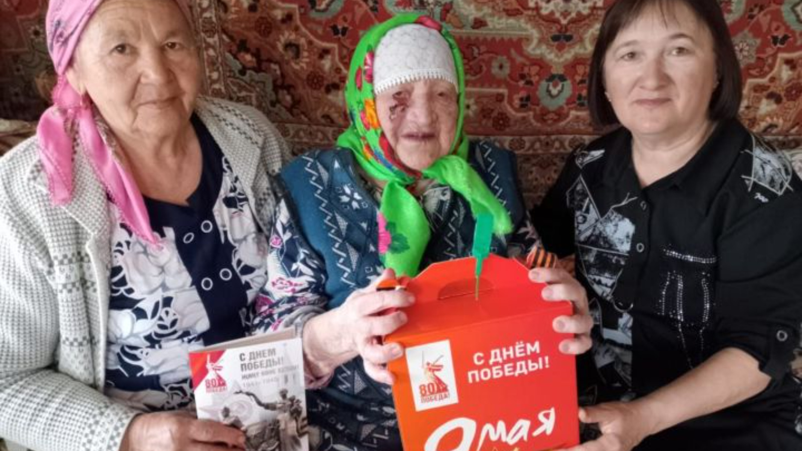 Җирлек администрациясе вәкилләре ветераннар советы активистлары белән берлектә геройларга Рөстәм Миңнехановтан истәлекле бүләкләр һәм котлау открыткалары тапшыру өчен шәхсән үзләре килделәр.