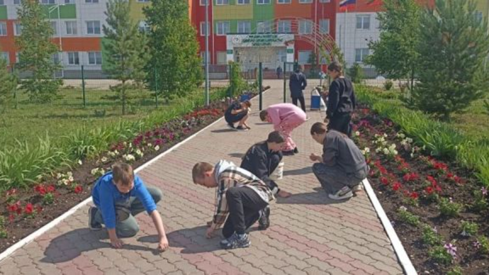 Урыссу гимназиясенең җәйге хезмәт лагеренда укучылар территорияне бик теләп төзекләндерәләр: чәчәкләр утырталар, яшеллекләрне карыйлар, мәктәп ишегалдын һәм спорт мәйданчыгын тәртипкә китерәләр.