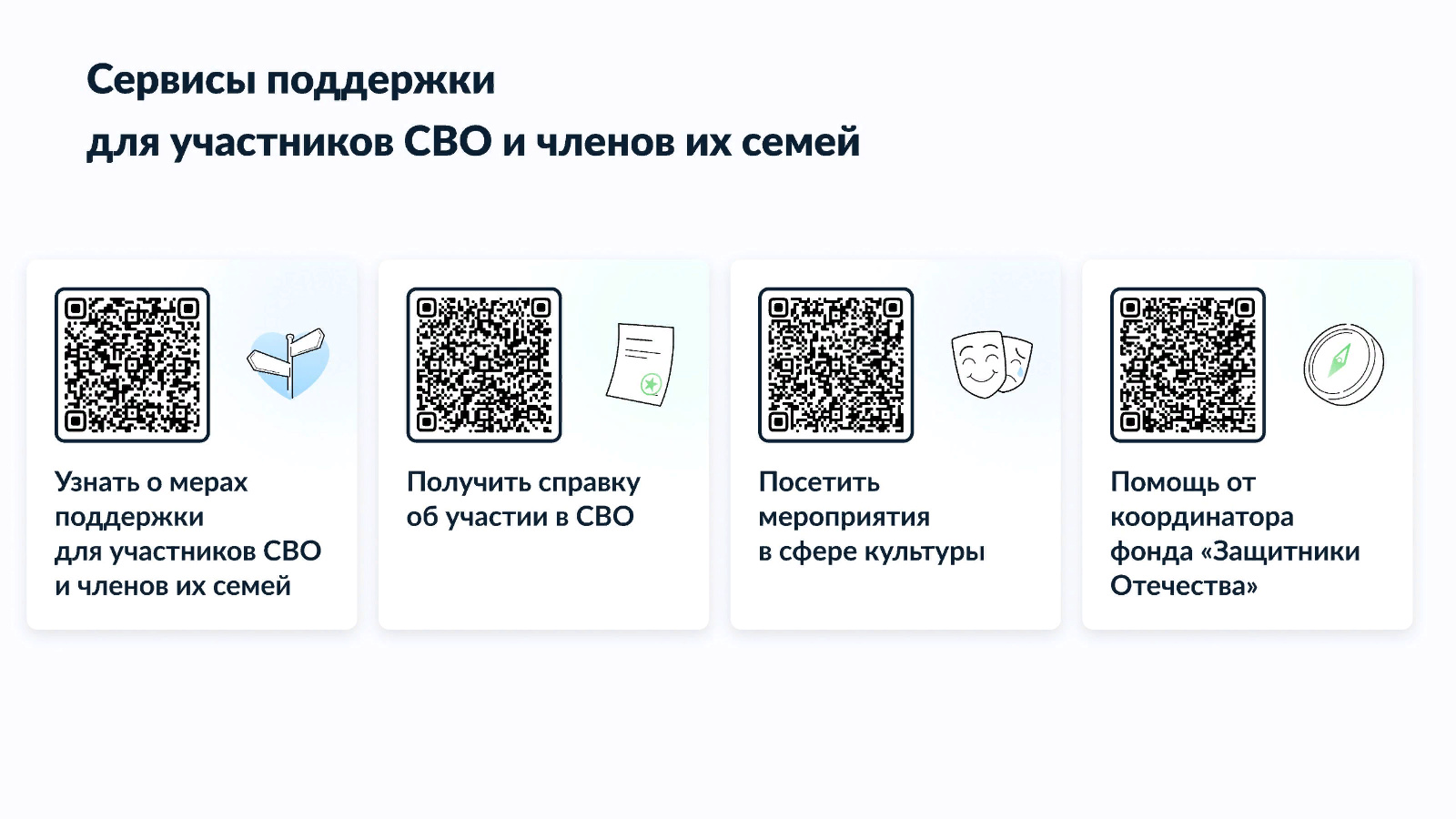 Ярдәм сервисы «Госуслуги» порталындагы тематик бүлекләргә алып баручы сылтамаларны үз эченә ала — хәрби хәрәкәтләр ветераны статусын алу яки СВОда катнашу турында белешмәләр, анда мәдәният өлкәсендәге чараларга язылырга яки үз төбәгендә «Ватанны саклаучылар» фонды координаторыннан ярдәм алырга.